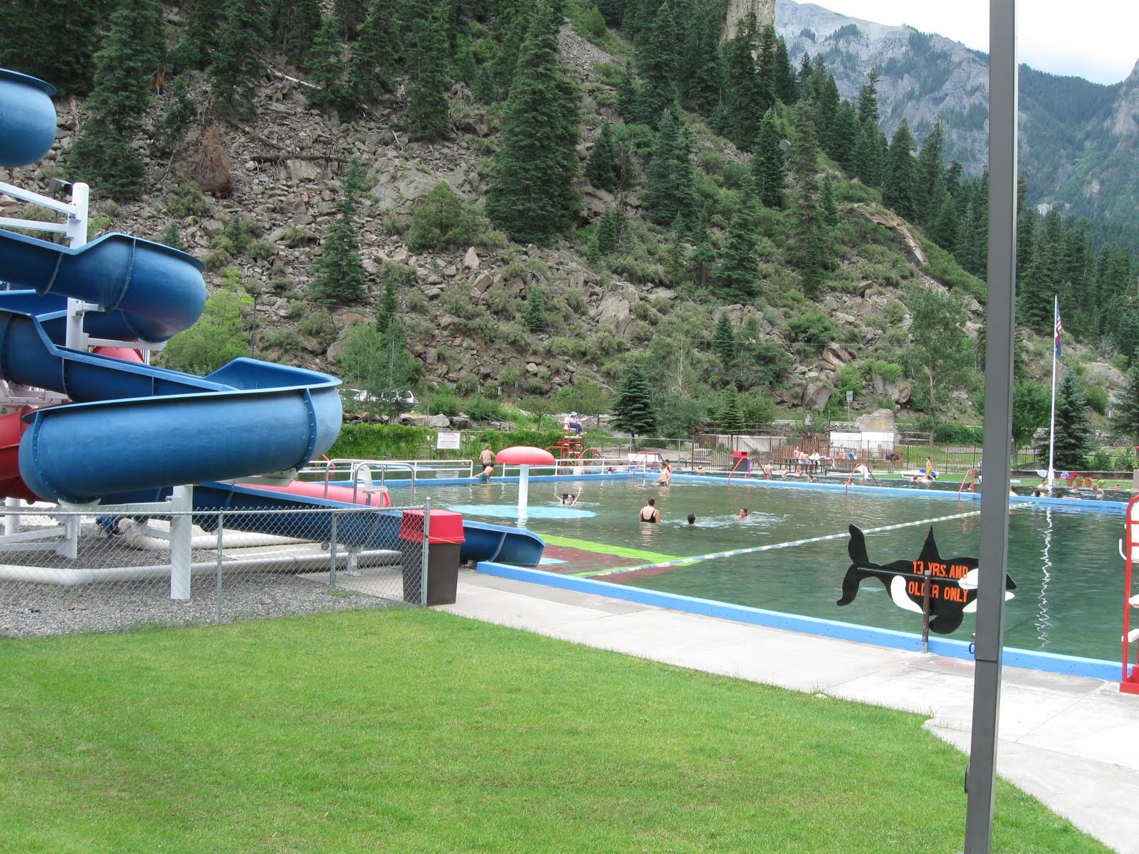 Stopped at Ouray Visitor Center and took a look next door at Ouray Hot Springs, run by the city of Ouray, which is fed by natural hot spring waters piped directly from Box Canon Park. We have not visited these hot springs which are fairly crowded most of the time, and more of a "public pool" arrangement than the natural setting we prefer.