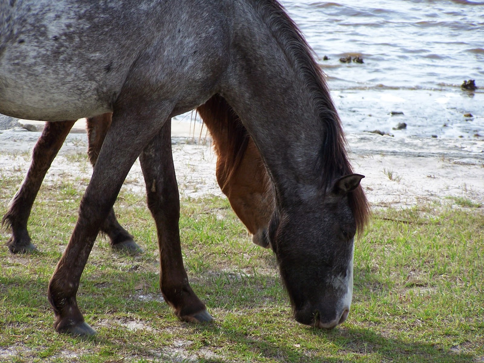 We encountered several groups of "wild" horses (feral) in the Dungeness area. These are larger (up to 15 hands) with longer backs and longer legs than the smaller horses / ponies at Chincoteague and other areas north of here. Popular myth is that these descended from horses shipwrecked or abandoned by Spanish explorers in the 1500's; more likely, these are descended from horses brought by English settlers in the 1700's with some mixing of other horses brought over in the 1900's. There are about 150 on the island today; some visitors never see them, so we were very lucky to have seen so many of these beautiful animals in this pristine environment.
